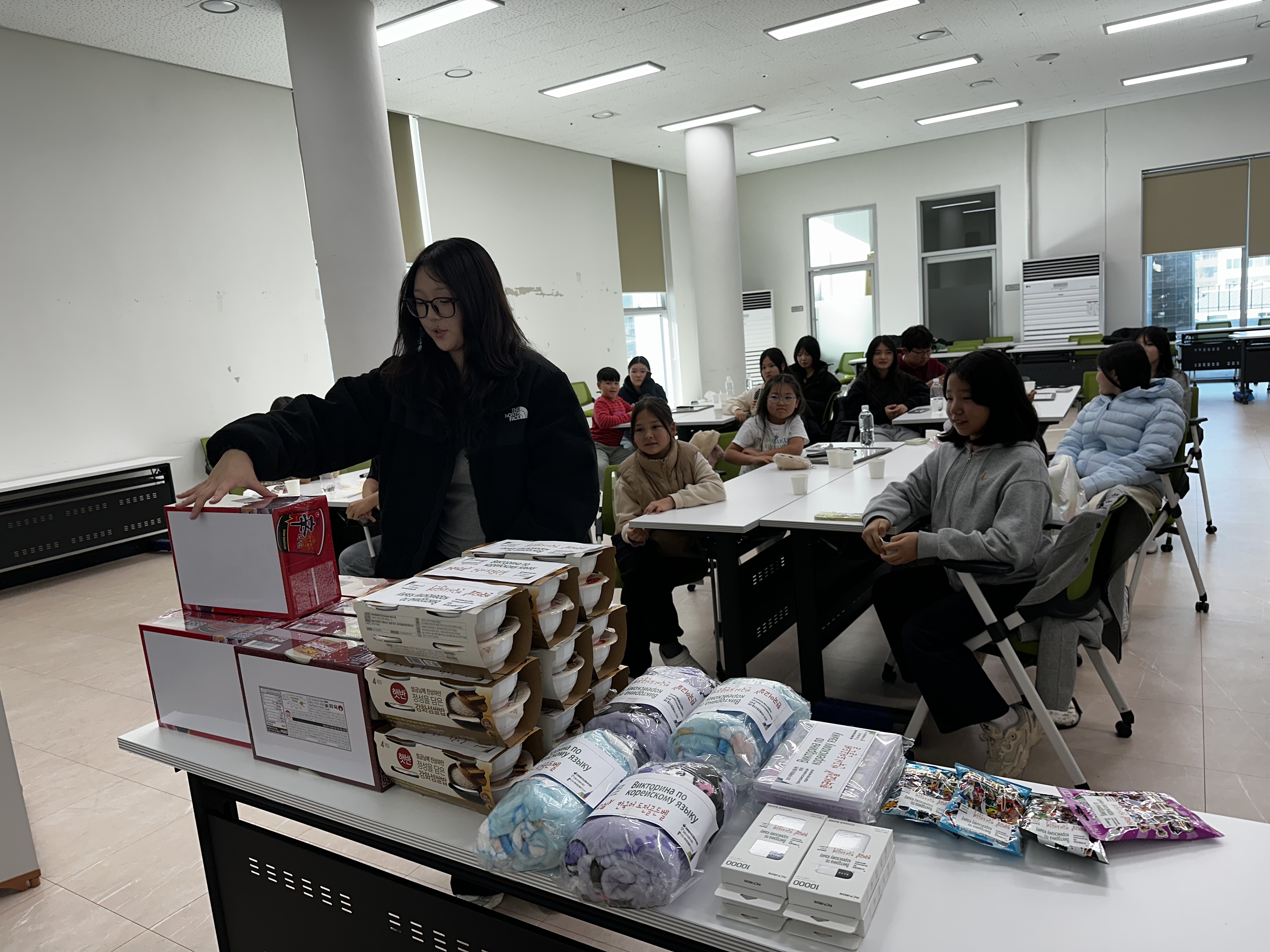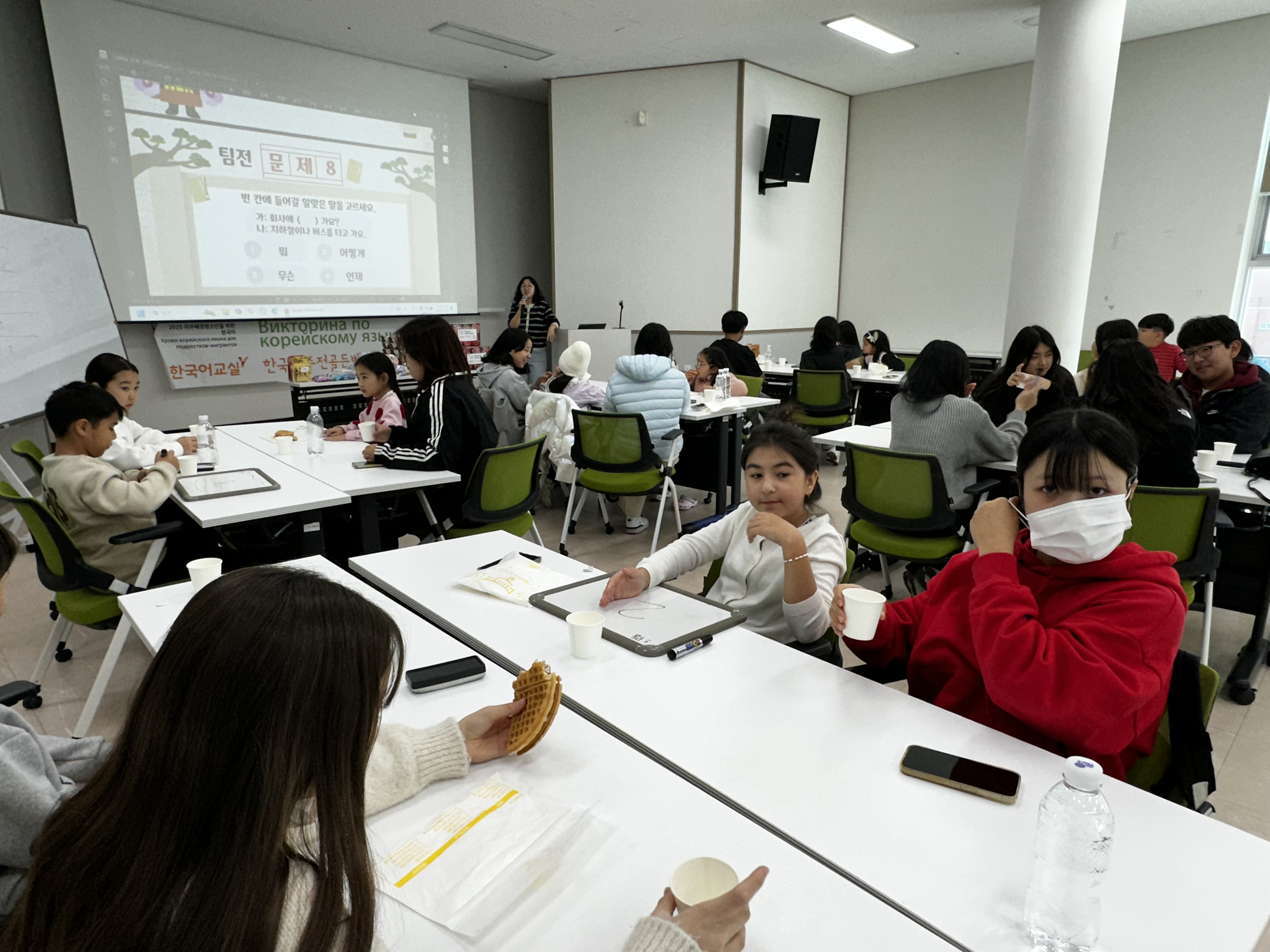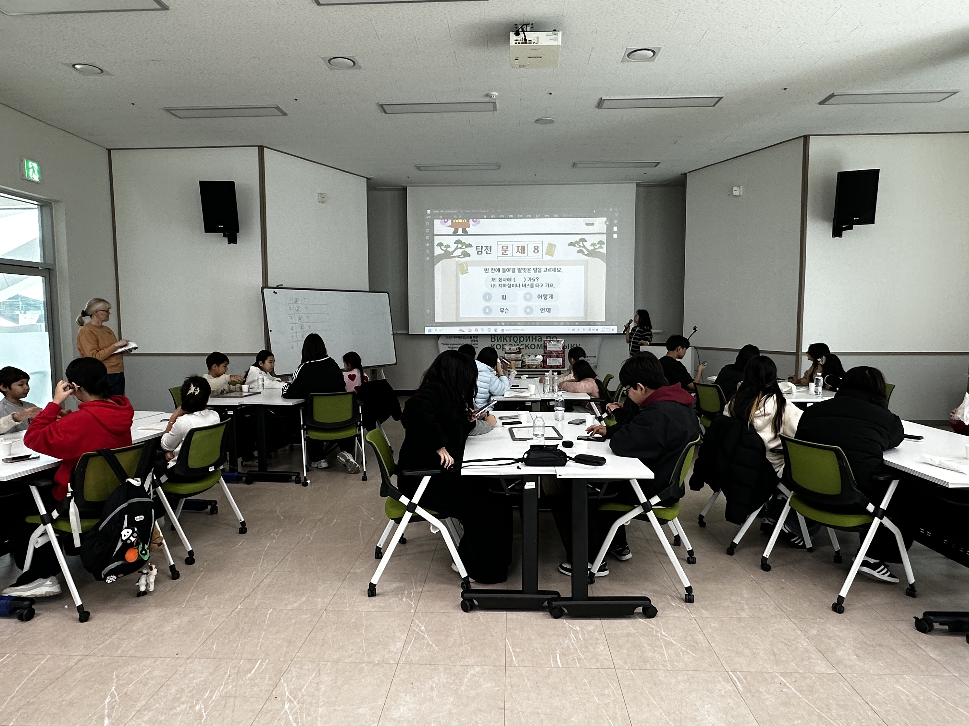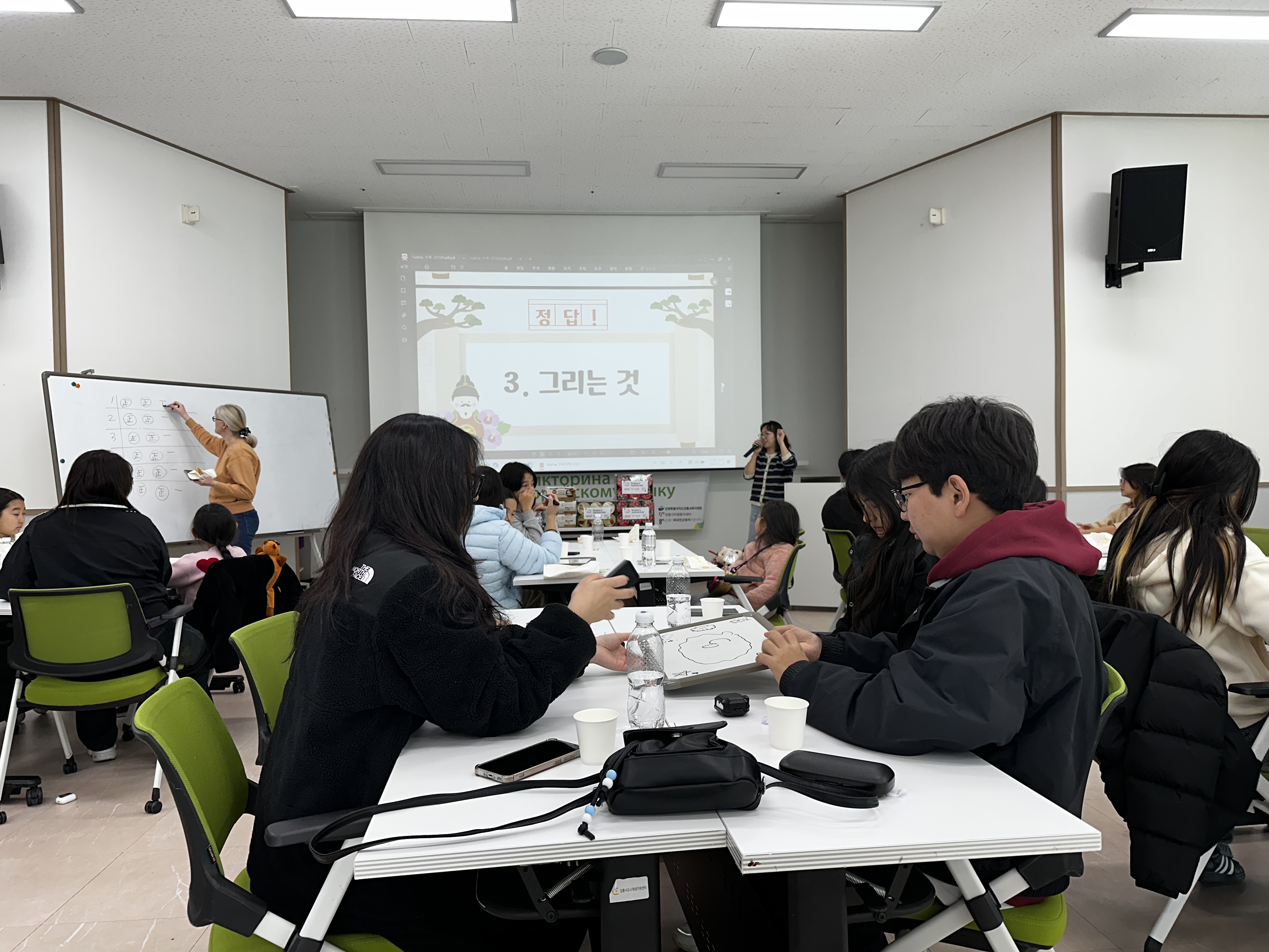 행사는 김예솔 선생님의 진행으로 체계적이면서도 유쾌하게 이어졌으며, 옐레나 선생님의 통역 지원으로 모든 참여자가 문제를 이해하고 적극적으로 참여할 수 있었습니다. 또한 원활한 운영을 위해 센터 직원 3명이 행사 보조로 함께하며 현장을 꼼꼼히 지원했습니다.
