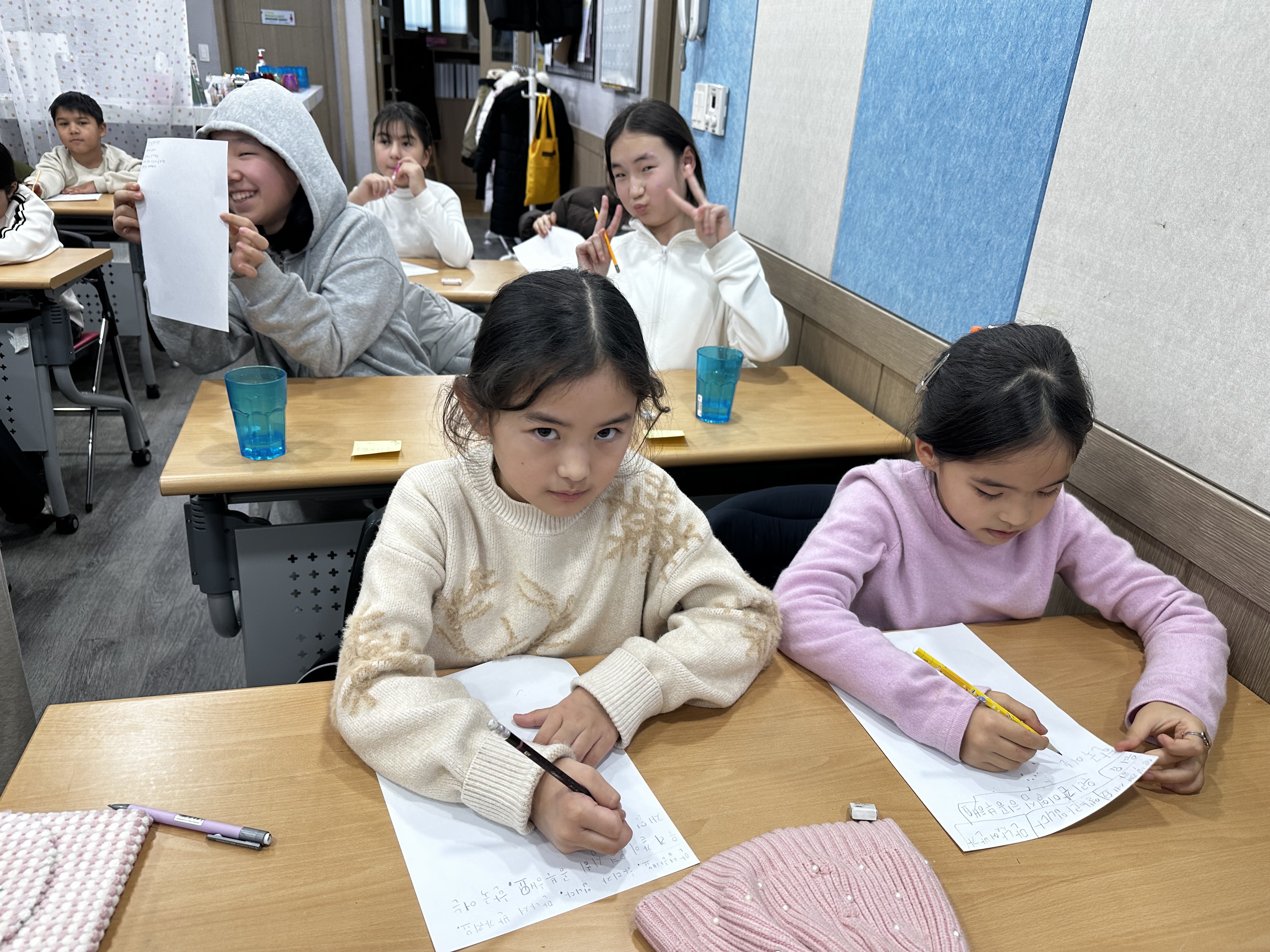 단순히 한글을 쓰는 것을 넘어, 자신의 마음을 한국어로 표현해 보는 시간이었어요. 서툰 발음과 글씨지만 정성스럽게 "저는 사탕을 좋아해요", "공부는 조금 힘들어요"라고 적어 내려가는 아이들의 모습에 교실 안은 웃음꽃과 따뜻함이 가득했답니다.